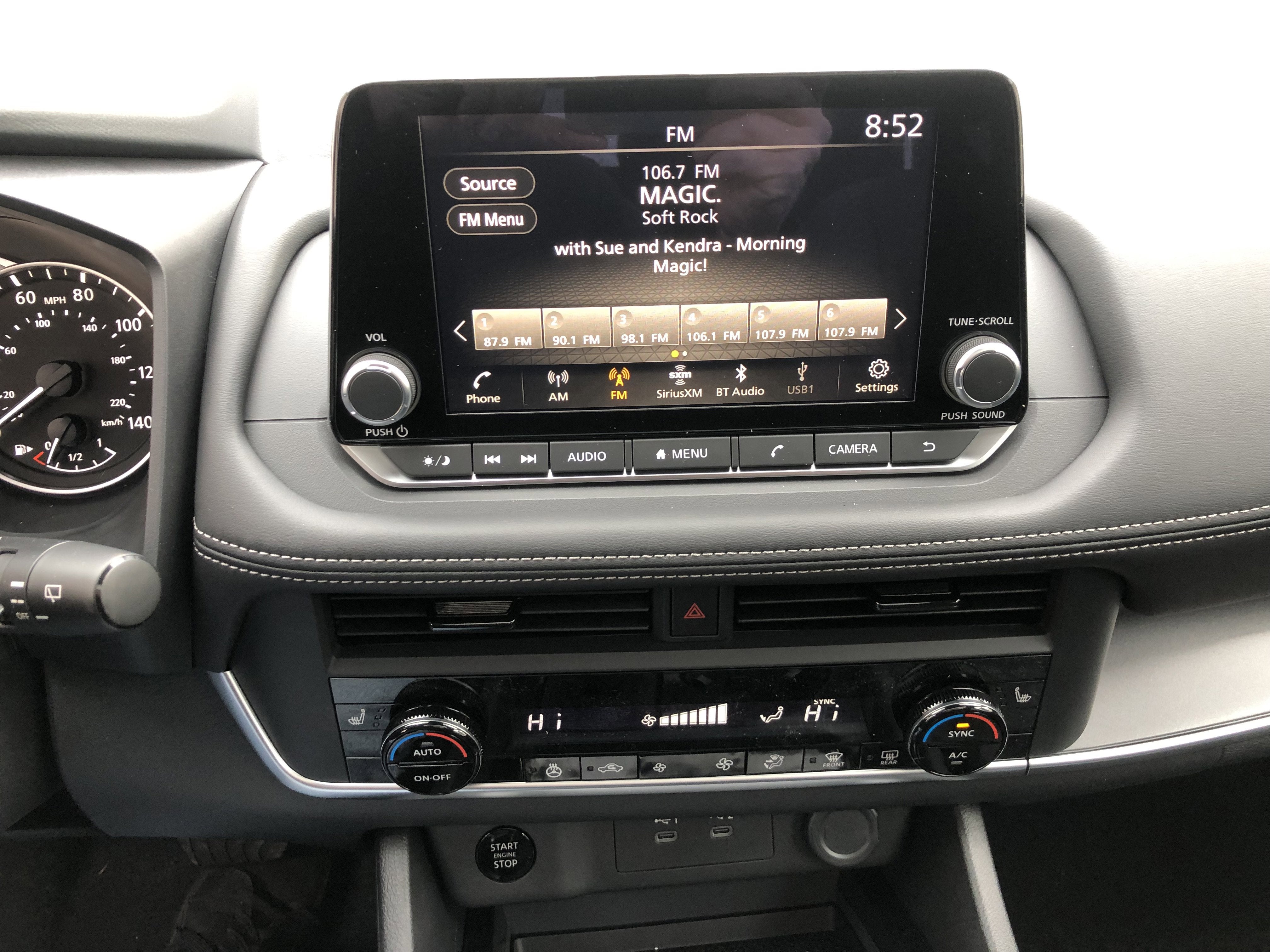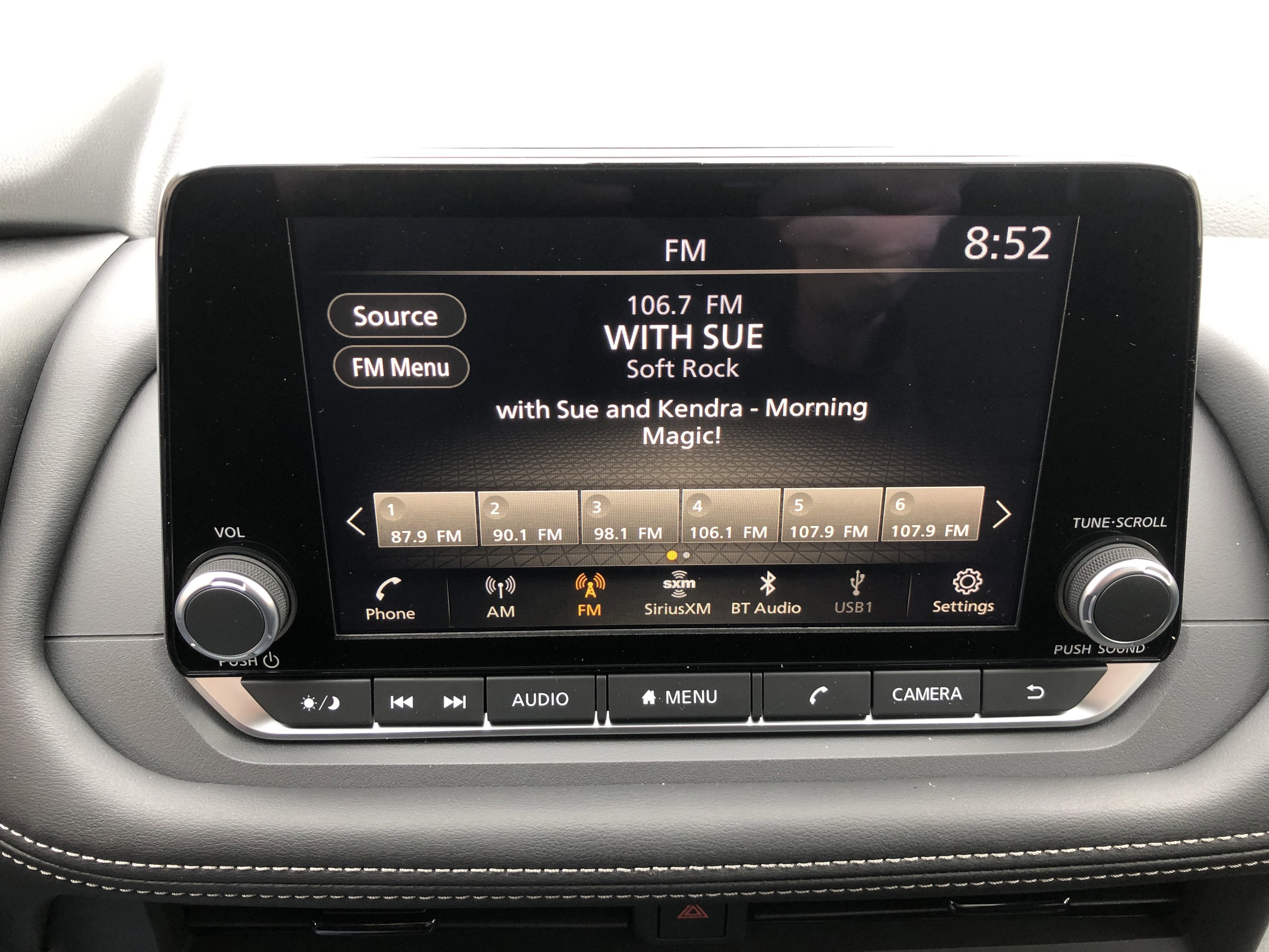 - Radio: AM/FM NissanConnect -inc: 6 speakers plus 2 tweeters, Apple CarPlay, Android Auto, 8" color touch screen display, Bluetooth®, 2 front USB type-C, Wi-Fi hotspot and NissanConnect Services powered by SiriusXM